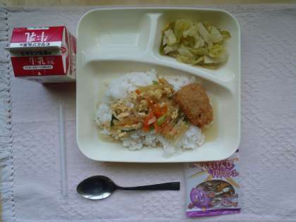 カツ丼は、子どもたちに人気の献立です。カツを最後まで残している人がたくさんいました。「あれ、残ってるよ、嫌いなのかな、食べてあげようか。」と冗談を言うと「だめ、好きだから残してるの。」と言って体でブロックしていました。具と一緒に食べてもおいしいんだけどなあ。