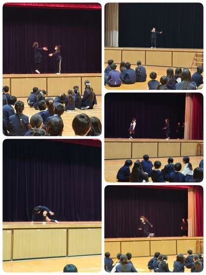 今日の児童集会は「ジェスチャークイズ」でした。クイズは全部で5問。集会委員の子ども達が舞台で順にジェスチャーをして、なかよし班みんなで相談して答えを決めていました。