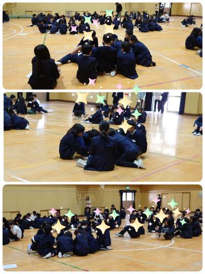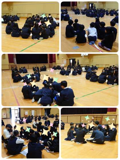 ジェスチャーの1つ目は「バレーボール」、2つ目は「バスケットボール」、3つ目は「野球」、4つ目は「ボウリング」、5つ目は「バドミントン」でした。今日の集会活動も6年生がリードしながらなかよし班で仲よく活動することができていました。