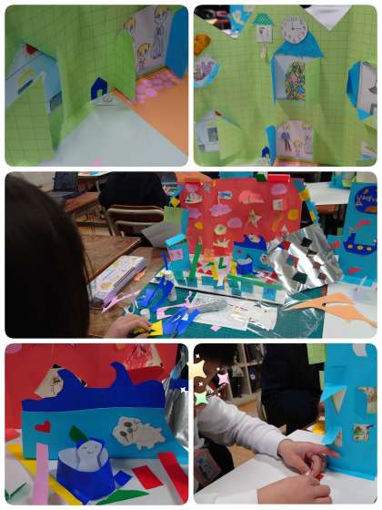 カッターナイフを使って工作用紙を切り抜いたり、はさみで好きな形に切ったりしながら、たくさんの窓を作りました。そこから子ども達の世界が広がります。いろいろな人や動物、キャラクターが窓からこんにちは。夢がいっぱいにふくらんでいる様子で、いろいろなお話が広がっていきます。「これはお城だから・・・。」「この下の小さい窓からねずみさんがのぞいてるよ。」「水族館だからいらっしゃいってお迎えしてるねん。」「階段も工夫してみたよ。」など、みんな楽しげに教えてくれました。お気に入りの作品になりました。