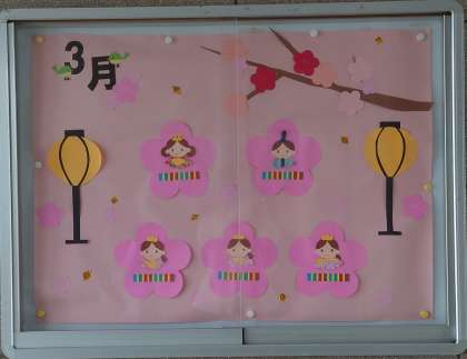 3月の玄関掲示は、桃の節句(ひなまつり)です。着物は千代紙で作ってあり、とてもおしゃれになりました。