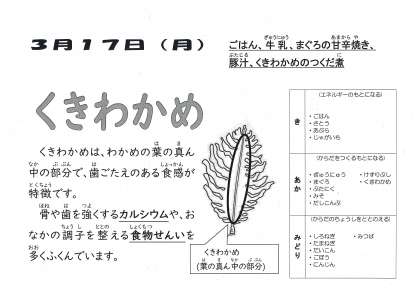 今日は、珍しい食材の茎わかめが登場しました。コリコリした歯ごたえが特徴です。給食のつくだ煮は、優しい味で、みんなおいしそうに食べていました。