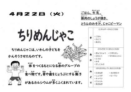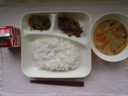 じゃこピーマンは、ごはんによく合う献立なのですが、「ピーマンはきらい」という人が多い献立でもあります。1年生にも「好きじゃない」人がいましたが、「少しなら」と食べてくれました。だんだん慣れるから、大丈夫ですよ。