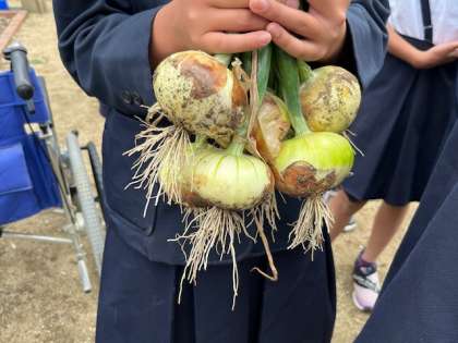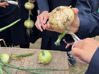 収穫した玉ねぎのいらないところをハサミで切り落とします。