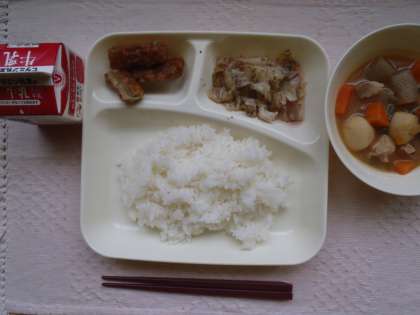 1年生は、みそ煮や和え物があまり得意でない人もいますが、「ちょっと食べてみておいしかったらおかわり来てね」と先生が声をかけると、何人もおかわりに来てくれました。