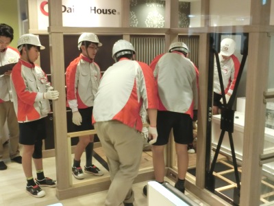 午後になり、フードコーナーでグループになって、ピザやカレーライスなどの昼食【写真左】をとりました。館内の2階には、出版社【写真中】や住宅建築現場【写真右】、新聞社、飛行機のパビリオンがあり、本物さながらの仕事体験をしていました。子どもたちはいくら時間があっても足りない様子で、集合時間ぎりぎりまで目いっぱい体験を楽しみました。