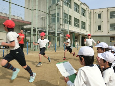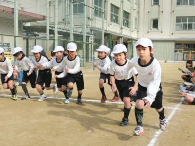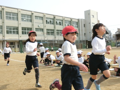 2月5日(金)、大阪城公園での「中浜マラソン2015」は、かぜ様疾患等の流行を防ぐため中止としましたが、2年生では5限の体育の時間に、「マラソン大会」を行いました。寒波は少し緩み、無風の好天で「マラソン」にはぴったりのコンディション。運動場の小トラックを10週(約800m)走り、タイム計測を行いました。ペアを組んだ人に「がんばれ!」と声を掛け励ましたり、周回を伝えてあげたり、ゴール後のタイムを記録していました。1月12日からの「耐寒駆け足タイム」の成果もあり、ペース配分を考えた素晴らしい走りができました。
