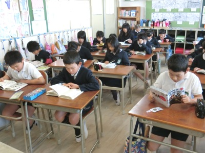 朝の「あいさつ運動」は代表委員会【写真左】が担当ですが、5・6年生がいないので、4年生の4人だけで行いました。集団登校【写真中】も5・6年生の班長・副班長がいないので、寂しい登校になりました。今日の中浜小学校の最高学年は4年生です。4年生【写真右】には、半袖ポロシャツの元気な児童が3名います。今日も朝の「読書タイム」では、静かに本を読んでいました。