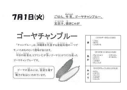ゴーヤはにがうりのことで、苦い味が特徴です。給食のゴーヤは、あまり苦くないように調理しています。でも、子どもの味覚は鋭いので「やっぱり苦い」という人はたくさんいます。「なれればおいしい。」という人もいて、残食もほとんどありません。