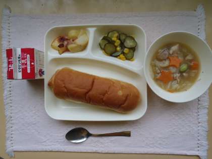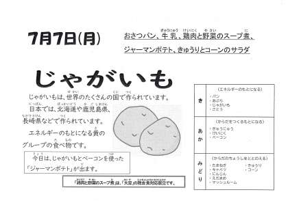 優しい味のスープ煮には、ラッキーにんじん♪が入っています。今日は七夕なので、星型がたくさん入っています。教室で「あ、星だ★」「ハートもある」と、喜んでいました。