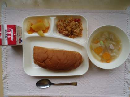 優しい味のスープと、デザートのミックスフルーツと一緒に、今日もしっかり食べました。