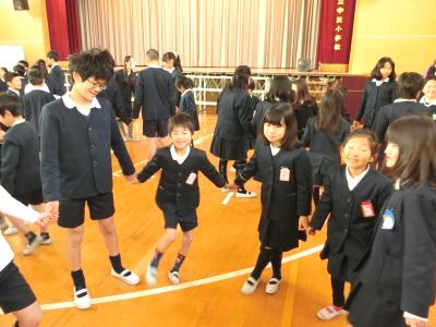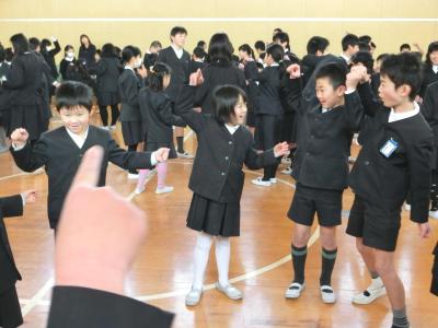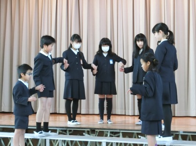たてわり班で輪になって、右手で輪を作って、左手の人差し指を隣の人の右手の穴に入れます。集会委員が「たこ」と言ったら右手を握り、左手の人差し指はぬくというゲームです。「た・た・たこ」「た・た・たこライス」「たいやき」などがお題に出され、児童は機敏に指を握ったり、ぬいたりしました。今日は反射神経が問われるゲームを楽しみました。