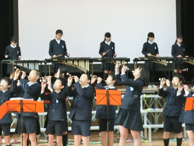 そして卒業生からは、動きながらの合奏「テキーラ」と二部合唱「絆」のプレゼントもありました。在校生は、6年生のすばらしい演奏と歌に感動していました。最後は、「みんなで歌おう」です。この1年間のなかよし班活動の映像をスライドショーで流しながら、226人全員で「RPG」の曲を歌いました。