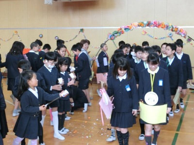 卒業生は「似顔絵メダル」と思い出の「カード」を持って、在校生の花道を通って退場しました。在校生は紙クラッカーで紙吹雪を飛ばしながら見送りました。最後の思い出の「はばたき集会」で、226人分の笑顔と「ありがとう」の感謝の気持ちをあふれさせた集会になりました。