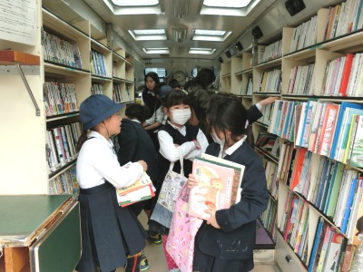 3月8日(火)10時10分、中浜小学校南門のところに「自動車文庫」のまちかど号がやってきました。毎月第2火曜日が、自動車文庫の日になっています。この日を待ちわびた1年生の児童たちは、2時間目終了後の休憩時間に、自動車文庫で先月に借りた絵本や童話を返却して、新たに20冊も借りていました。家に持ち帰って読むのではなく、学校で毎朝の「読書タイム」に読んでいるということでした。