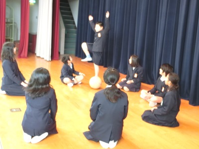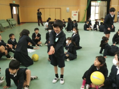 なかよし班で円になり、鈴がなっている間はボールを回し、シンバルがなったらボールを止めます。ボールを最後に持った人が、モノマネをします。お題は、「アヒル、8.6秒バズーガー、クマムシ、ゴリラ」などでした。今年度のなかよし班の活動もこれが最後です。少し寂しい気持ちになるところを、おもしろい表現をして、班のみんなを笑わせている児童もいました。4月になれば新しい班編成になります。