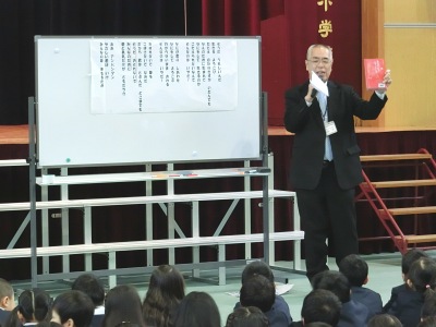 最初にやなせたかしさん作詞の「手のひらを太陽に」の歌を聞き、続いて「アンパンマンのマーチ」の歌詞を読みました。歌詞の背景やその意味を教えてもらい、かっこよくないけれど、アンパンマンが大好きというお話でした。本当の「正義の味方」とは、「困っている人を当たり前のように助けたり、親切にしてあげたりできる人」です。児童の皆さんも「アンパンマンのような心をもった正義の味方」になってほしいと思います。