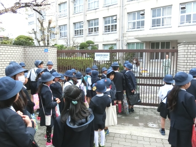 4月8日(金)、春休みも終わり2週間ぶりの集団登校でしたが、8時5分の開門前には、早くに登校した児童が待っていました。1年生はお兄さん、お姉さんに手をひかれて登校していました。