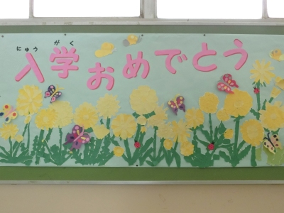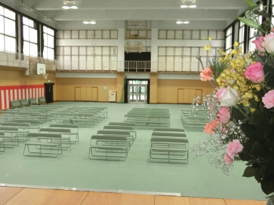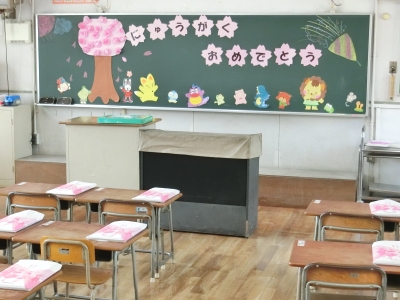 式場【写真左】や1年生教室【写真中】、廊下の掲示【写真右】など、準備万端整いました。いよいよ明日、新1年生をお迎えします。