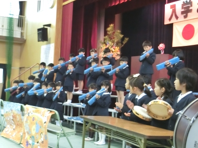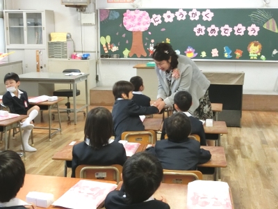 校長先生からは、「”はい”という言葉は、周りの人やお友だちを幸せにする『魔法の言葉』です。今日からは大きな声でしっかりと返事をして、お友だちをいっぱいつくってほしい。」というお話がありました。新2年生の「歓迎のことば」【写真中】が、新入生にとって何よりの入学祝いになりました。式の後、新入生の皆さんは教室に移動し、担任の先生から一人ずつ名前を呼ばれると、元気な声で「はい!」と返事をしていました。