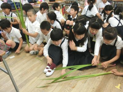 今日の紙芝居は、日本の昔話「くわず女房」でした。飯を食わない美しい女房が、実は頭上に大口のある山姥(やまうば)であったという話。 男はあぶないところで菖蒲(しょうぶ)の生えている池に逃げ込み助かりました。菖蒲はその香りが魔よけとなるという理由から、五月の節句に家の軒先に飾ったり、湯に入れるようになりました。子どもたちは、山姥の目を突き、退治をしたという菖蒲の葉を折って、香りをかいでいました。