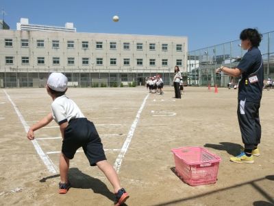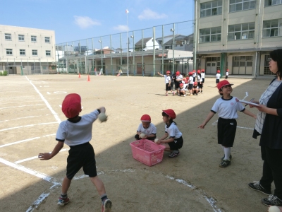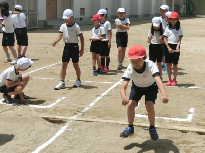 1年生【写真左】は、初めてにぎるソフトボールでしたが、全員が上手投げをしていました。2年生【写真右】は、昨年よりも記録は伸びて、最高20m投げる児童もいました。4年生【写真中】は、砂場で「立ち幅とび」を実施しました。砂場の手前の踏切線から、助走なしでどのくらい跳べるか測ります。明日からは握力や上体起こし、50m走などのスポーツテストを実施し、結果は今後の体育の授業等に活かしていきます。