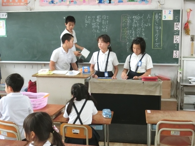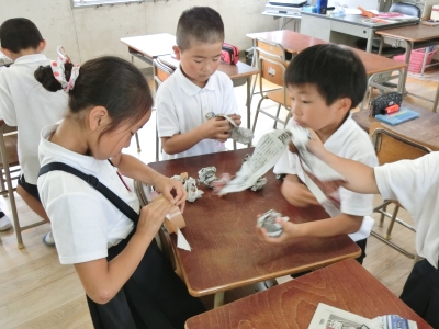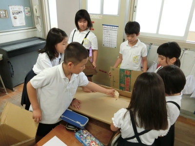 異学年の児童で「なかよし班」を構成し、それぞれが考えた「遊びのお店」を運営します。各教室に分れて、お店の名前や遊びのルールなどを話し合い【写真中】ました。今年度は、宝さがしや福笑い、的当て、重さあてクイズ、イントロクイズなどを行います。早速、新聞紙や段ボール、画用紙で道具や看板を作っていました。