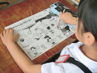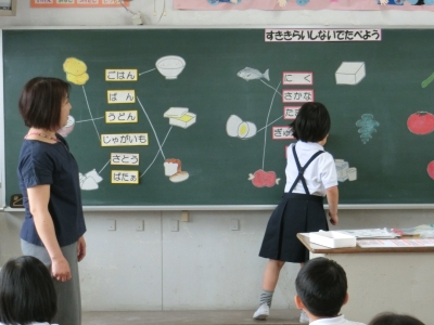 6月1日(水)2限、1年生では「栄養教育推進事業」として、城東区内小学校の栄養教諭の先生に来ていただき、「すききらいしないでたべよう」【写真左・中】を学習しました。体をつくる・熱や力のもとになる・体の調子を整える食べ物について、みんなで考えていきました。