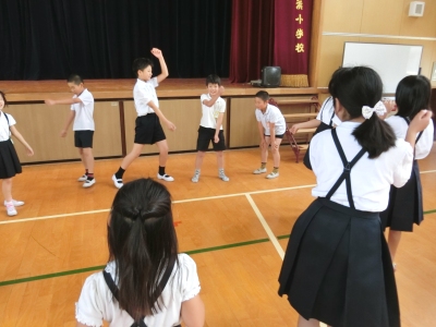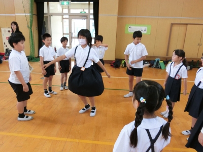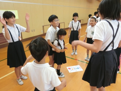 なかよし班で円になって、真ん中の人が「ぴよぴよさん」と言いながら踊りまわり、周りの人も「ぴよぴよさん」と言って、まねをしていくゲームです。なかには恥ずかしくて、6年生の班長さんに手伝ってもらっている児童もいました。来週の児童集会は、「古今東西」を行います。
