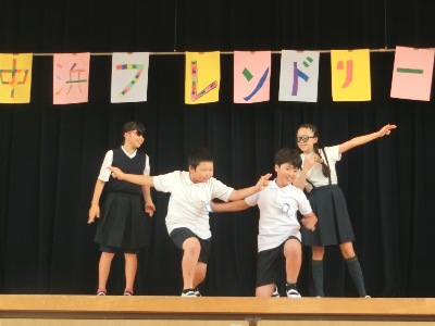 6月8日(水)午前、全校児童の交流を広げるために「中浜フレンドリーランド」を開催しました。本校の特色ある取組みの一つです。異学年の児童でたてわり班を構成し、それぞれが考えた「遊びのお店」を運営します。8時40分から各お店の準備にかかり、9時10分から体育館で開会式を行いました。各お店の「30秒CM」【写真左】の後、2班が1組になり、前半・後半に分かれて、お店の運営役とお客さん役になりました。
