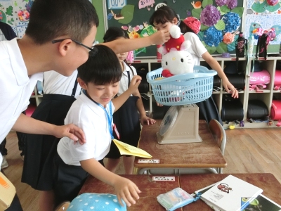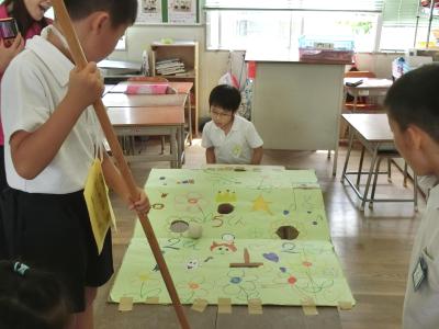 1・2班の「kgで?(クエスチョン)」【写真中】は、教室にある本や教具などをハカリにのせて、2kgと4kgちょうどの重さにするゲームです。3・4班はT字ほうきをゴルフのパターのようにして、軟式ボールを的に入れる「めざせゴルフ名人」【写真右】をしました。