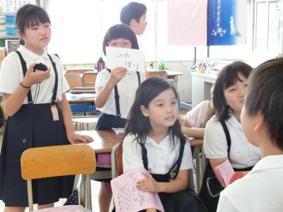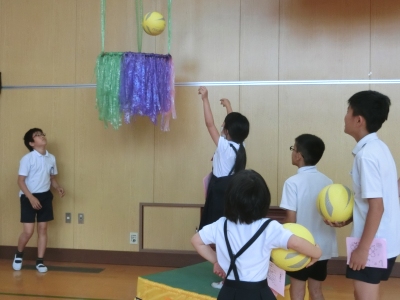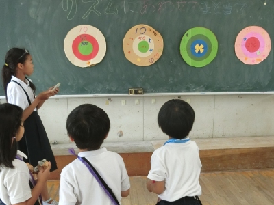 11・12班は、順番に示された曲をハミングして、その曲名を当てる「イントロクイズ」【写真左】をしました。いろいろな曲があって、当てるのはなかなか難しかったようです。13・14班は、体育館で「ボールでホイホイ」【写真中】をしました。バレーボールでバスケットゴールや特製ゴールにシュートをするゲームです。15・16班の「リズムに合わせて的当て」【写真右】は、音楽に合わせて踊りながら、黒板の的を目がけてボールを当て、点数を競うゲームです。