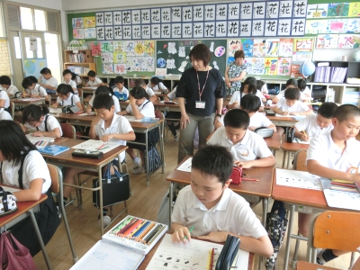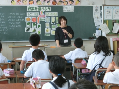 6月6日(月)2限、城東区内小学校の栄養教諭の先生に来ていただき、4年生は「野菜を食べよう」の学習【写真左】をしました。自分の知っている野菜をワークシートに書いて、色の濃い野菜と色のうすい野菜のグループに分けました。たくさんの野菜を食べるには、煮たり、炒めたり、ゆでたりすることを学びました。