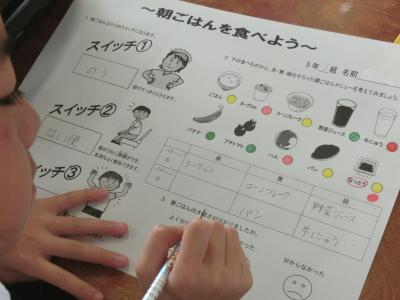 3限、5年生は「朝ごはんを食べよう」の授業で、朝ごはんは、「脳・排便・体温」の3つのスイッチを入れるために、欠かしてはいけないことを学びました。(血や肉、骨をつくる)、(熱や力のもとになる)、(体の調子を整える)のそろった朝ごはんのメニューを考えました。