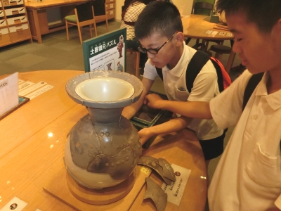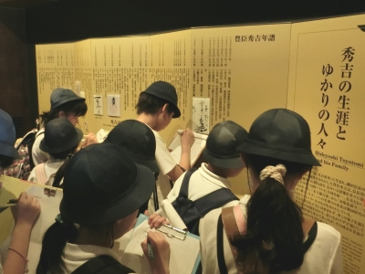 歴史博物館では、古代から中世近世、近代現代フロアを順にまわりました。再現された発掘現場では、考古学にもチャレンジ【写真左】しました。昼食は大阪城天守閣横の石垣のところ【写真中】でいただきました。その後、天守閣の階段を一気に天守台まで駆け上り、展望台から大阪の町を一望し、その後は、豊臣秀吉の生涯とゆかりの人々【写真右】について調べました。これから社会科の学習で、歴史新聞を作っていきます。