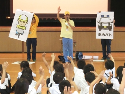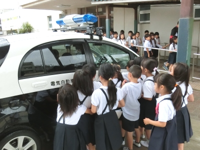 あんパト「あんぜんクイズ」では、「自転車は車の仲間である、友だちと並んで走らない。外ではひとりで遊ばない、知っている人でも勝手について行かない。」などを学びました。朝会後、1年生は体育館前に停めてある電気自動車「あおパト」を、興味深くのぞき込んでいました。