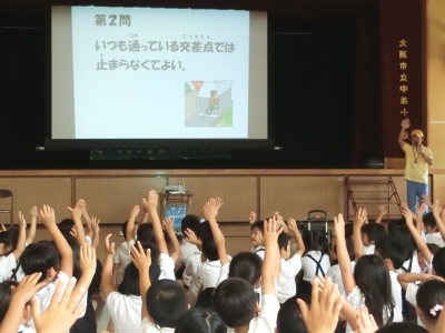 6月13日(月)、今日の児童朝会は、城東区役所「子どもあんしんパトロール隊(あんパト)」から3名の方に来ていただき、あんしん・あんぜんについて、お話をしていただきました。