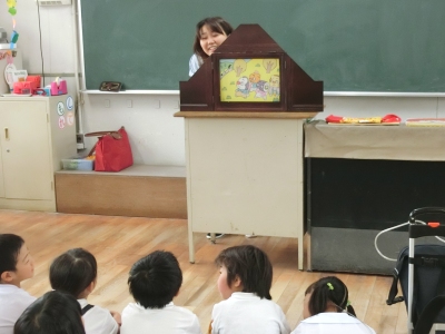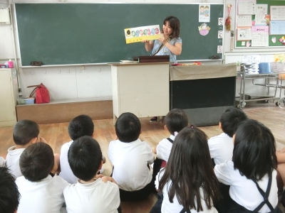 絵本「だるまなんだ」と「うがいライオン」、そして紙芝居「おべんとうのえんそく」を読んでもらいました。ボランティアさんは初めての読み聞かせということで、少し緊張されていましたが、子どもたちは集中してお話を聞いていました。子どもたちに聞くと、全部の物語がおもしろかったという感想ばかりでした。