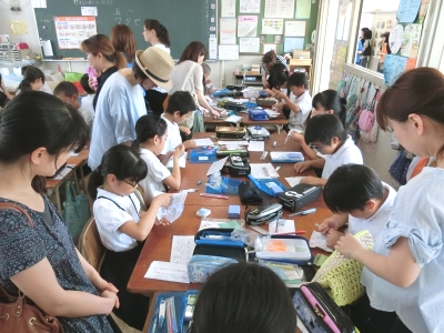 高学年の「授業参観」では、4年生【写真左】は、国語「漢字辞典の使い方を知ろう」を、6年生【写真右】は、保健「ストレスとの上手なつき合い方」の授業を教室で行いました。5年生【写真中】は家庭科「はじめてのソーイング」で、初めて裁縫の授業をしました。参観に来られたお母さん方に教えていただきながら、「玉結び・玉どめ」に挑戦しました。