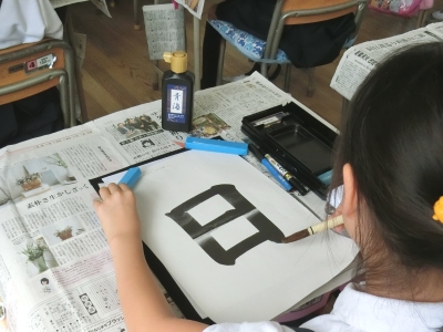 3年生になって3回目の書写の時間で、これまでに「一」「土」を書きました。手本を筆でなぞって【写真左】から、姿勢・筆の持ち方・穂先の向き・穂先の通り道・筆圧のうち、一つのめあてを立てて練習をしていきました。半紙4枚練習をした後、清書をしフェルトペンで学年・名前を書いて提出しました。後片付けは、前回のときよりもとてもスムーズにできるようになりました。次回は「人」という字を書きます。