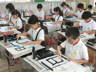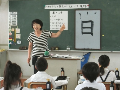6月29日(水)1限、3年生では国語科・書写「校内研究授業」がありました。単元は筆使いを学ぼうで、本時のねらいは「自分のめあてを立てて、折れる方向と筆使いに気をつけて「日」を書く」です。