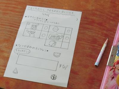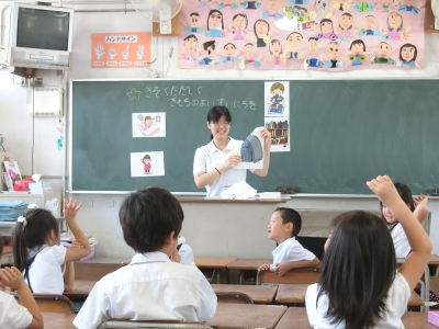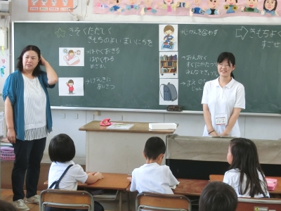 自分たちの生活を振り返り、規則正しく気持ちのよい一日を過ごすために、どのようなことに気をつければよいかを考える授業でした。「決まった時間に起きるには、きっちりとご飯を食べるには、忘れ物をしないためには」などについて、どうすればよいかを発表していきました。夏休みに向けて、「早寝・早起きをする、お手伝いをする、みんなで協力する」など、自分なりの目標を立てることができました。