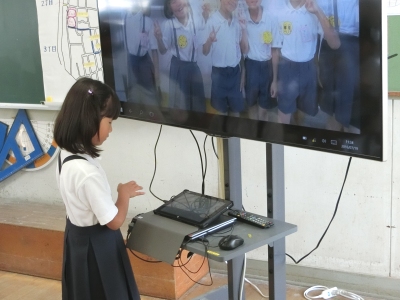 1・2・3丁目ごとに班で分かれて校区を「町たんけん」した様子や、気づいたことについて発表していきました。当日にデジカメで撮った写真をタブレットPCに取り込んで、大型ディスプレイに映し出し発表していきました。大きな声ではきはきと発表しており、練習の成果が伺えました。お友だちのよいところを見つけることができた、発表会になりました。