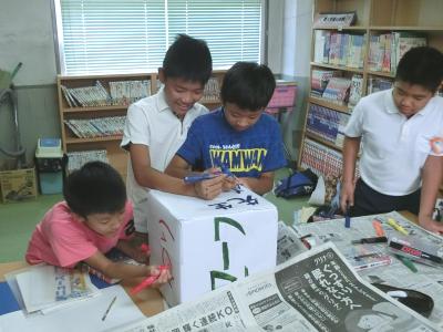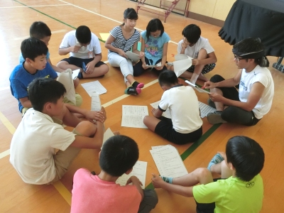 午前中は図書準備室で、ゲームで使うサイコロを製作していました。午後からは体育館に集まって、林間学習1日目夜の「キャンプファイヤー」の進行確認と歌やゲームの練習を行っていました。火の神「カネーコン」による点火に始まり、6つのスタンツ、終わりのセレモニーという3部構成になっています。みんなで盛りあがって、思い出に残る楽しいキャンプファイヤーにしようと、児童たちは一生懸命でした。大自然の中で、素晴らしい「夏の思い出」をつくりましょう。