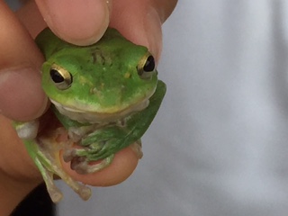 児童たちは、芝生広場【写真右】でバッタや天然記念物の「モリアオガエル?」を捕まえ、集まっていました。