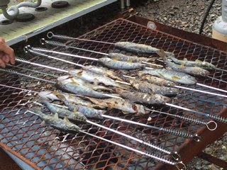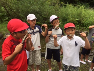 14時からは、宿舎裏の小川で「魚つかみ」を行いました。鉢伏山から湧き出た川の水は、足が痛くなるほど冷たいです。長時間、川に入っていると、麻痺して冷たさを感じなくなった児童もいました。それでも子どもたちは、悪戦苦闘しながらも78匹の「アマゴとヤマメ」を素手で捕まえました。採った魚は、宿舎の方に串刺しにして塩焼きにしてもらい、美味しくいただきました。