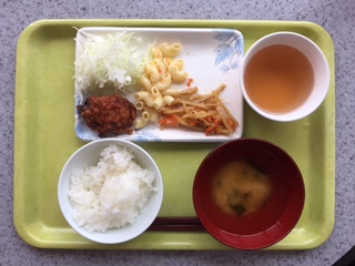 7時30分から朝食でした。「二日目の朝食」のメニューは、「鳥の唐揚げ・塩鮭(写真なし)・キンピラゴボウ・マカロニ・キャベツ・ご飯・ワカメのみそ汁」でした。他に味つけ海苔とキュウリの漬物が用意されていました。食事係の「ごちそうさま」のあいさつの後、各自で片づけをしました。しっかりと食べて、今日も一日「寝て・食べて・動いて」を基本に、活動しましょう。