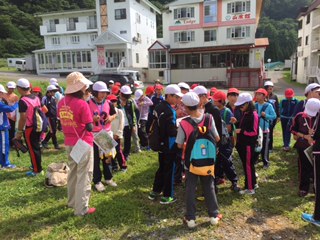 7月27日(水)9時、林間学習最後の活動「鉢伏山登山」です。宿舎前広場からスタート地点まで約20分登りました。スタート地点からは、2分おきにスタートし、途中のチェックポイントで歌やゲームをし、ゴールをめざします。円陣を組んで、気合いを入れて元気にスタートする班もありました。それぞれのチェックポイントでは、課題が与えられます。78名全員が頂上をめざして、出発しました。