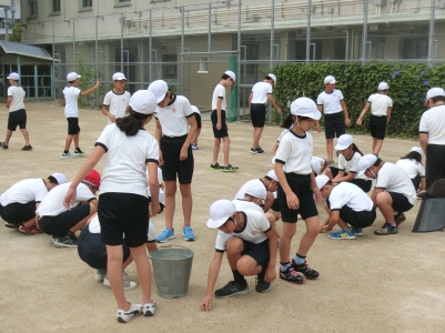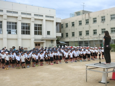 9月5日(月)、今日の「児童朝会」は今年度初めて、運動場で行いました。校長先生からは今日の「大阪880万人訓練」にあたって、「釜石の奇跡」についてお話がありました。また生活指導担当の先生からは、校外での「○丁目たんてい遊び」について、注意【写真左】がありました。