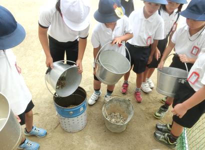 その後、10月2日の運動会に向けて、1年生から6年生全員で、運動場の「石ひろい」を行いました。学年ごとにエリアを決めて、運動場の小石を集めました。今週から本格的に運動会の練習がはじまります。心を一つに協力して取り組み、素晴らしい運動会にしてほしいと思います。